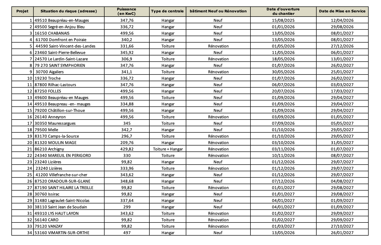 En complément du financement participatif, une term sheet a été signée pour la mise en place de la dette bancaire et doit permettre de sécuriser le financement global du portefeuille, assurer la bonne exécution des travaux et viser des mises en services échelonnées entre l’été 2026 et l’été 2027.
